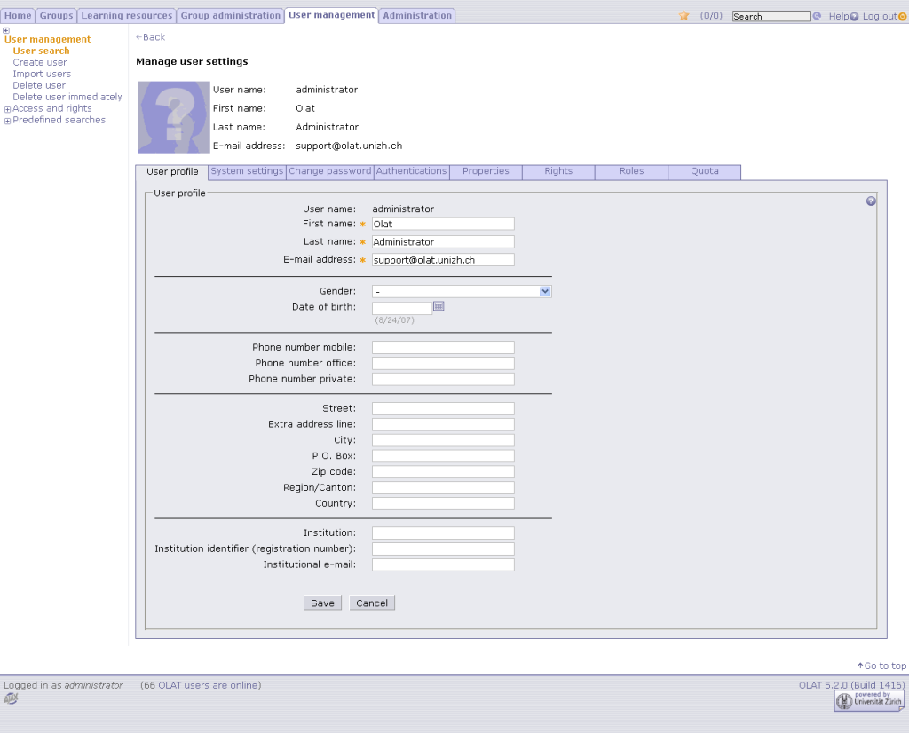 Bu profil, kişisel verilerinizi istediğiniz zaman uyarlamanıza olanak tanır. Ek olarak, dil veya yazı tipi boyutu gibi sistem ayarlarınızı değiştirme imkanı vardır. Herhangi bir kullanıcı OLAT şifresini değiştirebilir (varsa). Anlık Mesajlaşma modülü kuruluysa, gizlilik korumasıyla ilgili ayarları